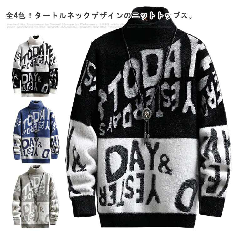 タートルネック ハイネック メンズ セーター バイカラー タートルニット 2XL ニットトップス 英字プリント カットソー 長袖 もこもこ ニットセーター 秋冬 おしゃれ 体型カバー M L XL 送料無料
