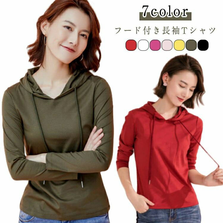 フード付き Tシャツ パーカー 長袖 プルオーバー tシャツ レディース 薄手 体型カバー シンプル 大人 カジュアル 着回し トップス 無地 秋 春 黒 定番 シンプル 白 フード ホワイト カットソー インナー カーキ 送料無料