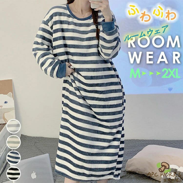 ルームウェア ワンピース 長袖 もこもこ 冬 裏起毛 ロング レディース ふわふわ ゆったり パジャマ ボア 暖かい 冬用 秋 かわいい 可愛い 大きいサイズ 厚手 寝間着 女の子 学生 寒さ対策 女性 部屋着 寝巻き 誕生日 プレゼント ギフト ボーダー THOM