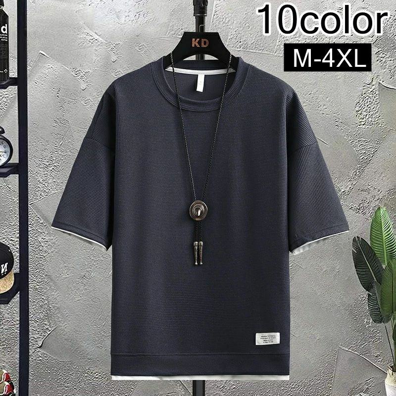 カットソー Tシャツ 半袖 五分袖 メンズ トップス フェイクレイヤード 重ね着風 ラウンドネック 無地 シンプル 大きいサイズあり カジュアル 男性 紳士 定番 着回し 普段着 デイリー 5分袖