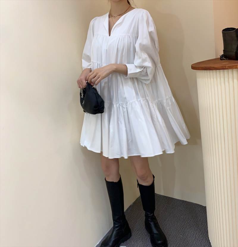【P2倍&クーポン有】レディース スカート ワンピース チュニック シャツワンピ ギャザースカート ミニスカート ミニ ショート 半袖 5分袖 ボリューム袖 パフスリーブ バルーン袖 Vネック 襟なし ノーカラー Aライン フォーマル バルーン 白 ホワイト 黒 ブラック