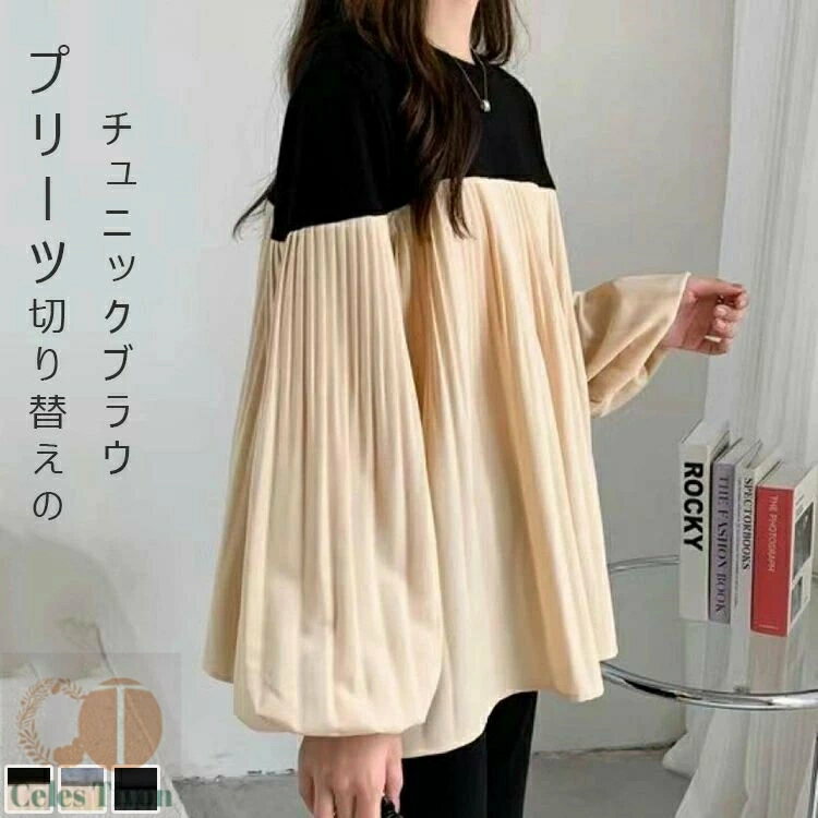 切り替え レディース 春 秋 チュニック プリーツ 長袖 異素材 ドッキング Aライン プルオーバー カットソー トレーナー シンプル ゆったり 配色 クルーネック ボリュームスリーブ 大きいサイズ ゆるっと こなれ感 フェミニン 日常 デート 通勤 お呼ばれ ママコーデ