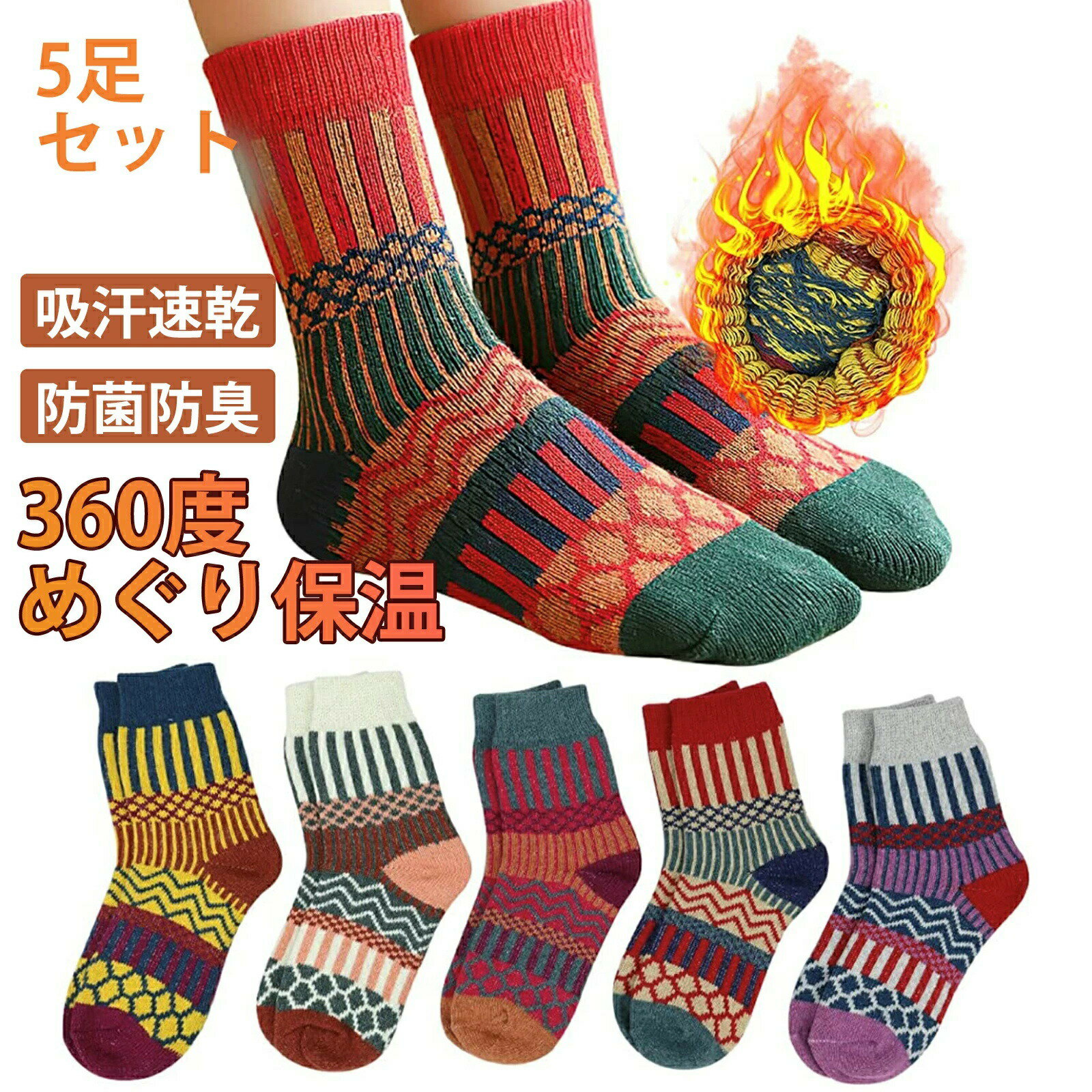 靴下 レディース ソックス 冬 5足セット 毛玉がでにくい 防菌防臭 吸汗速乾 サイズ褪せにくい 蒸れにくい 高い耐久性 伸縮性 カジュアルソックス ジャガード柄 おしゃれ