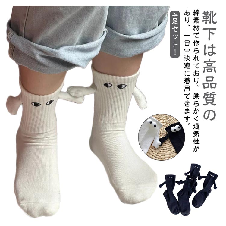 4足セット 靴下 面白い 磁気吸引 マグネット 手 目 可愛い 人形カップルソックス 手を繋ぐ靴下 メンズ レディース くつ下 男女兼用 韓国 クルーソックス スポーツソックス 双子コーデ カップルペア カップル用靴下 フェス 文化祭 黒 白 卒業プレゼント