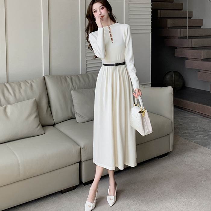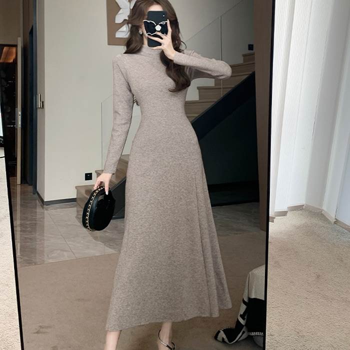 【P2倍&クーポン有】トップス ワンピース ドレス 秋 冬 ロング丈 長袖 ハイネック スリム タイト 細身 Aライン ブラック グレー アプリコット ブラウン オートミール 無地 サイズ豊富 S M L ガーデン レストラン 美脚 脚長 細見え 若見え 高見え 格上げ スタイルアップ