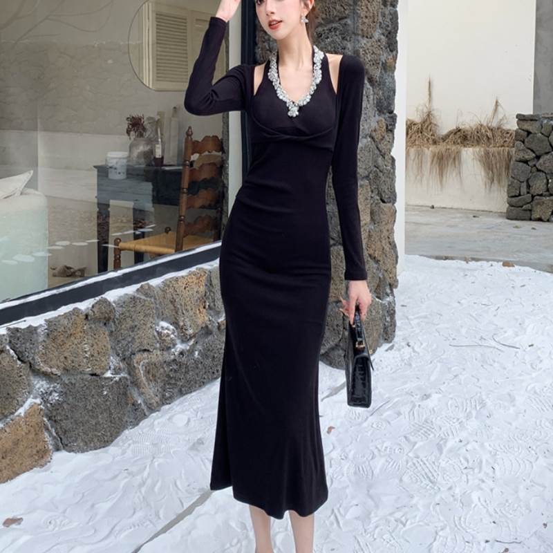 【P2倍&クーポン有】トップス ワンピース ドレス 秋 冬 ミモレ丈 長袖 襟なし スリム タイト 細身 ブラック 黒 無地 サイズ豊富 S M L パーティー ガーデン レストラン 1枚で決まる 美脚 脚長 華奢見え 細見え 若見え 高見え 格上げ スタイルアップ モテ ベーシ