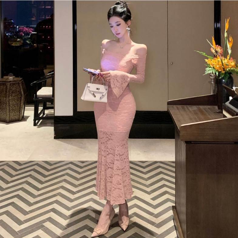 【P2倍&クーポン有】パーティー ドレス ひざ下 裾レース 半袖 ラウンドネック 襟なし スリム タイト S M L XL レストラン 華奢見え 着痩せ 効果 スタイルアップ 結婚式 二次会 エレガント きれいめ セクシー 女っぽ セレブ 高級感 10代 20代 30代 デート イン