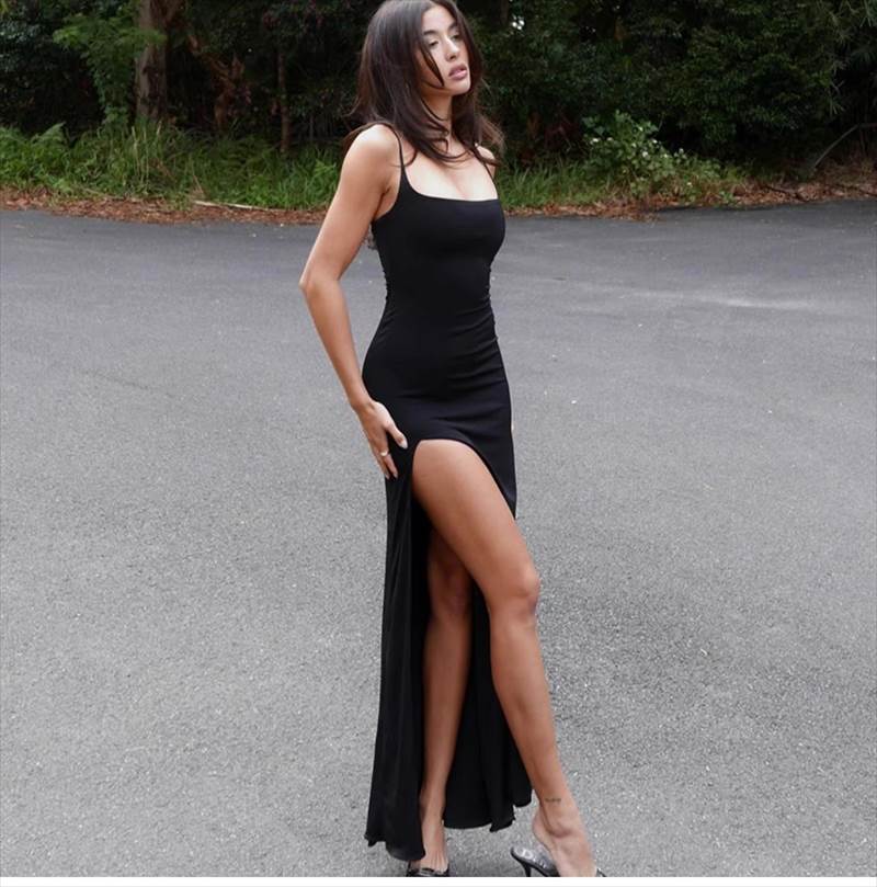 【P2倍&クーポン有】 ドレス ロング ロング丈 脚見せ マキシ スリムフィット スリム 細身 サイドスリット ウエストツイストノット ハイウエスト スクエアネック ボディコン お腹見せ タイト スクープネック マキシ丈 背中ファスナー ハイスリット 長袖