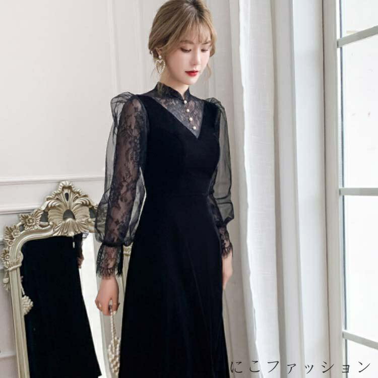 新生活 ワンピース レディース パーティードレス レース 透け感 ドレス お呼ばれ 秋冬 ロング丈 イブニングドレス 結婚式 黒 同窓会 二次会 オケージョン 韓国 成人式 ベロア ベルベット ロングドレス 披露宴 フォーマル セレモニー