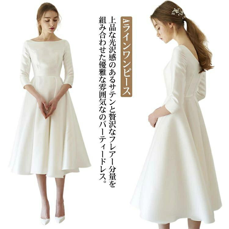 パーティードレス 袖あり 結婚式ワンピース 結婚式ドレス お呼ばれ 二次会 ミモレ丈 サテン 大きいサイズ 白 ホワイト aラインワンピース フレアワンピース 膝下丈 フォーマル 韓国 パーティ 披露宴 発表会 上品 高見え