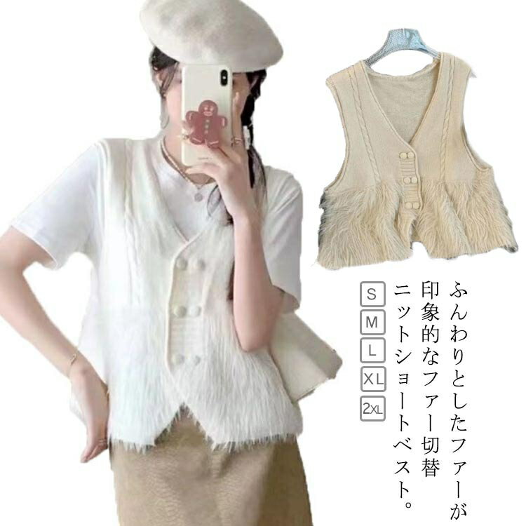 ファー切替ニットカーディガン ベスト ショート丈 レディース ファーベスト ジレ ショート 前開き ノースリーブ Vネック ジャケット コート アウター カーディガン 防寒 厚手 保温 暖かい カジュアル 秋 冬 重ね着 ふわふわ もこもこ トップス きれいめ 無地 フェミニン 上品