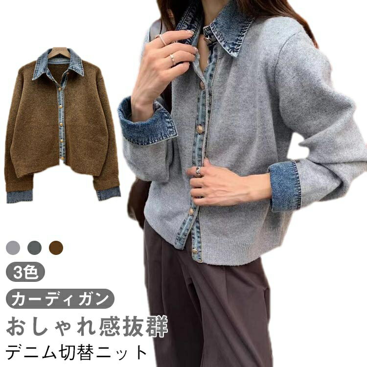 デニム切替 レディース 羽織り ニットカーディガン ニット カーディガン 長袖 トップス ジャケット デニム ニットカーデ 前開き 無地 秋 冬 おしゃれ ショート丈 アウター 暖か ドッキング カーディガン キャメル