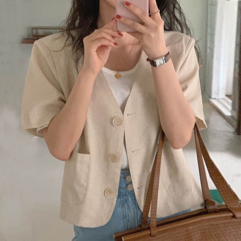 【P2倍&クーポン有】ノーカラー Vネック ポケット ボタン ストレート Iライン アウター レディース 上着 ジャケット 個性的 春 夏 ミディアム丈 半袖 デコルテきれい 鎖骨きれい 羽織り 前開き 落ち感 レイヤード すっきり 肌みせ 立体的 ハリ感 ブラッ