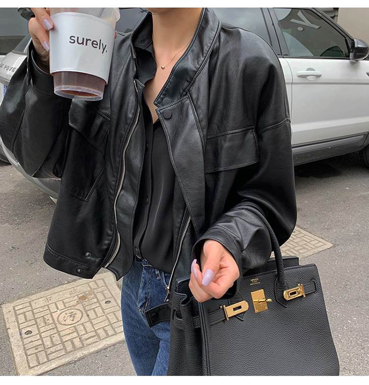 【P2倍&クーポン有】革ジャン ボタン ポケット アウター レディース 上着 ジャケット 個性的 春 秋 ミディアム丈 長袖 Vネック 襟付き スマート 羽織り 前開き レイヤード ヴィンテージ 立体的 ハリ感 ツヤ感 ブラック 黒 ブラウン 茶色 無地 M L XL LL 大きいサイズ