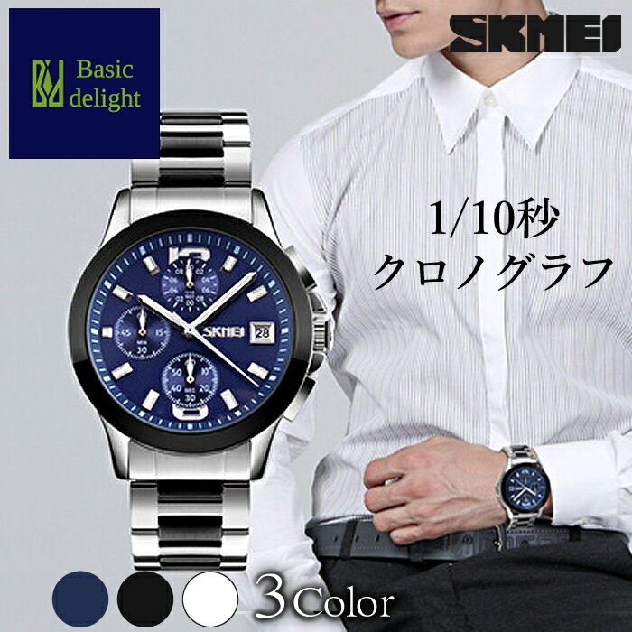 【1/10秒クロノ】 腕時計 時計 リストウォッチ クロノグラフ 1/10秒 スポーツ プレゼント 贈り物 ストップウォッチ デイト 夜光 6針 多針 メンズ バーインデックス ステンレス アナログ ブルー 青 ブラック 黒 ホワイト 白 シルバー 銀 生活防水