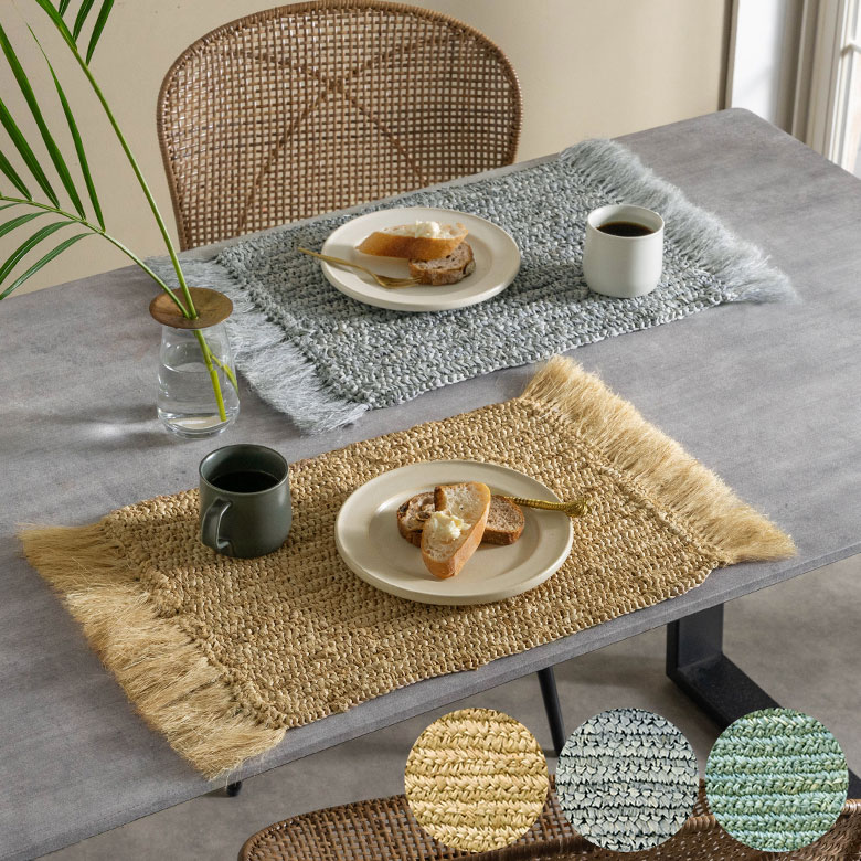 【最大500円クーポン】 ランチョンマット 天然素材 ラフィア フリンジ付き 60cm × 34cm ランチマット おしゃれ 椰子 素材 麦わら かわいい インテリア 長方形 フリンジ ナチュラル リゾートインテリア ナチュラル ライトブルー ライトブルー 西海岸 ハワイアン サーフ[1388]