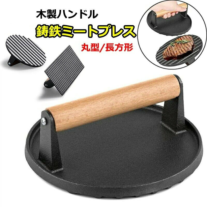 重し ミートプレス 肉 鋳鉄 ハンバーガープレス 大型 プレス機 料理 鋳物 ステンレス グリルミートプレス 木製ハンドル 調理器具 波型 海鮮 ホットサンド ステーキ 縮み 焼きムラ 反り返り 防止 食肉プレス ベーコンプレス 錆びない