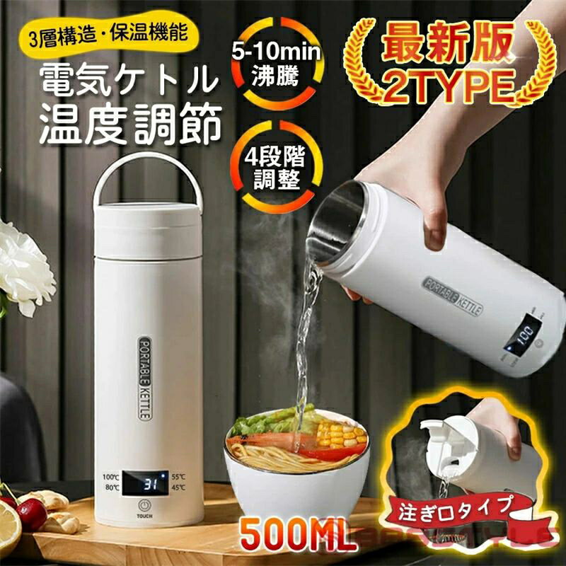 電気ケトル 電気ポット 電気水筒 ポータブル 500ml 旅行用 自動OFF 急速沸かし 4段階温度設定 空焚き防止機能 持ち運び 小型 漏れ防止