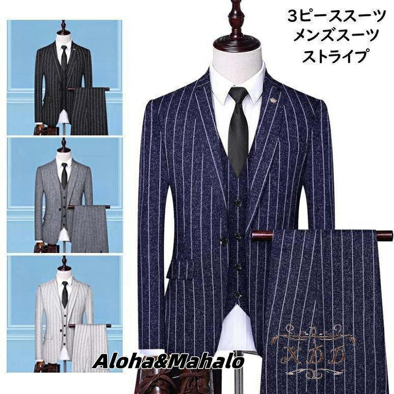 メンズスーツセット ビジネススーツ スリーピース スーツ ストライプ セットアップ +パンツ+ベスト 韓国風 スリムスーツ 3ピーススーツ 通勤