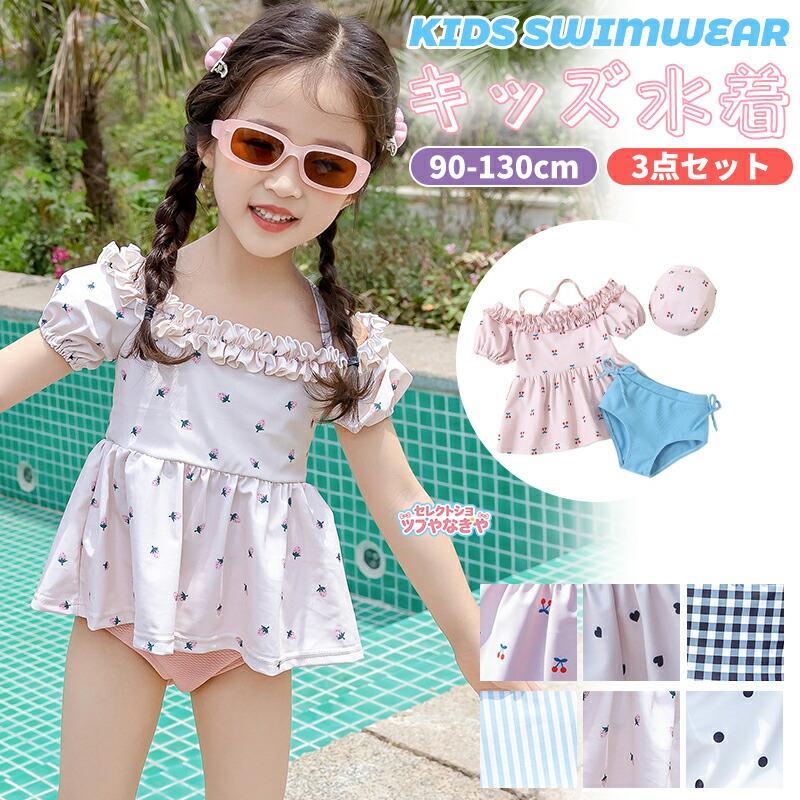S キッズ 水着 女の子 オフショルダー ペプラム風 トップス 半袖 ショーツ スイムキャップ 3点セット セパレート ハート チェリー フリル