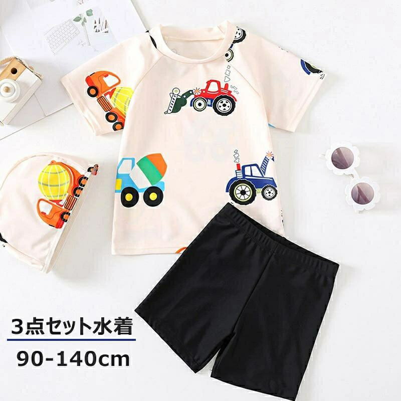 3点セット ベビー 水着 男の子 みずぎ 車柄 半袖 半ズボン 上下セット ラッシュガード セットアップ 幼稚園 小学生 キッズ水着 ジュニア 子供 スクール水着 スイムウェア スイミング プール 水遊び プレゼント 誕生日