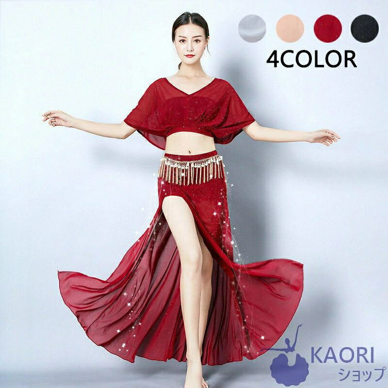 全4色 ベリーダンス 衣装 セット Belly dance ドレス インナーパンツ付き ベリーダンス衣装 2点セット 大人 大きいサイズ 発表会 練習着 ダンスセット 社交ダンス レッスンウェア レッスン着 レディース トップス+スカート 長袖 スピーカー袖 M L XL 送料無料