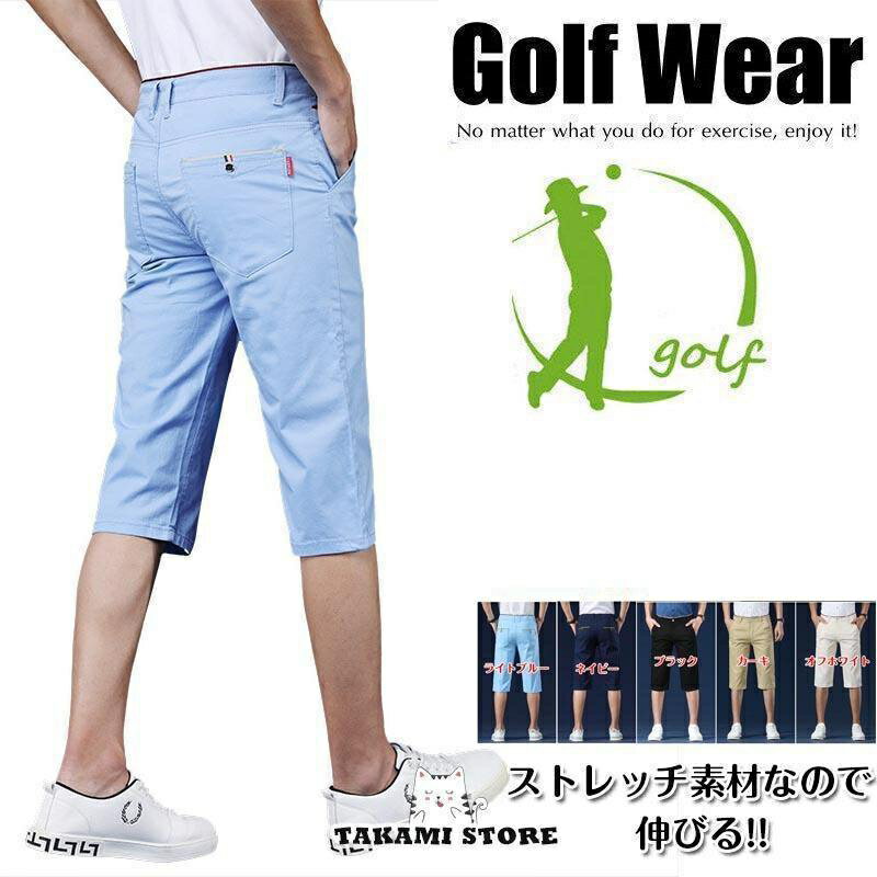 ゴルフウェア メンズ 夏 ストレッチパンツ ハーフパンツ 七分丈 膝下 ゴルフパンツ 半ズボン 無地 白 赤 紺 おしゃれ 春 秋