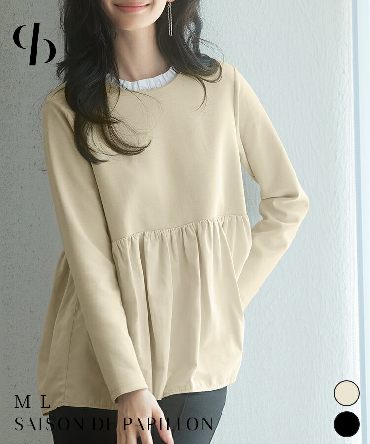 カットソー レディース トップス 長袖 2way 衿付き 衿取り外し ポンチ素材 切り替え ペプラムデザイン 体型カバー お腹周りカバー ヒップ周りカバー クルーネック オフィス 通勤 通学 春 秋 冬 カジュアル フェミニン SAISON DE PAPILLON sdp0222