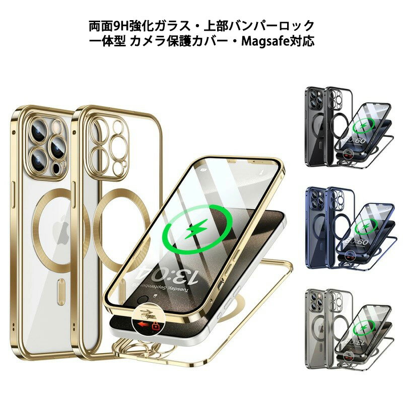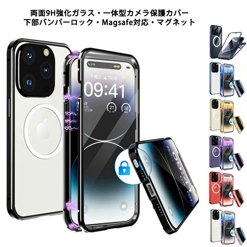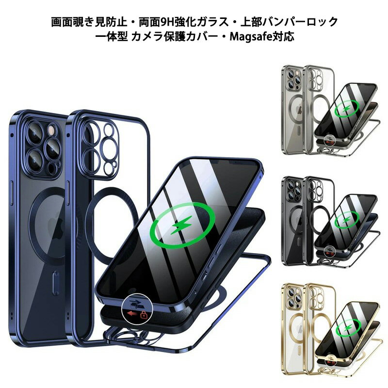 iPhone15 ケース 覗き見防止 一体型 Magsafe対応 上部バンパーロック iPhone 15Plus 15Pro 15ProMax ケース ストラップホール 両面 9H強化ガラス 背面透明 カバー アルミバンパー アイフォン15 15プラス 15プロ マックス カバー メタルバンパー カメラ保護 両面ガラス