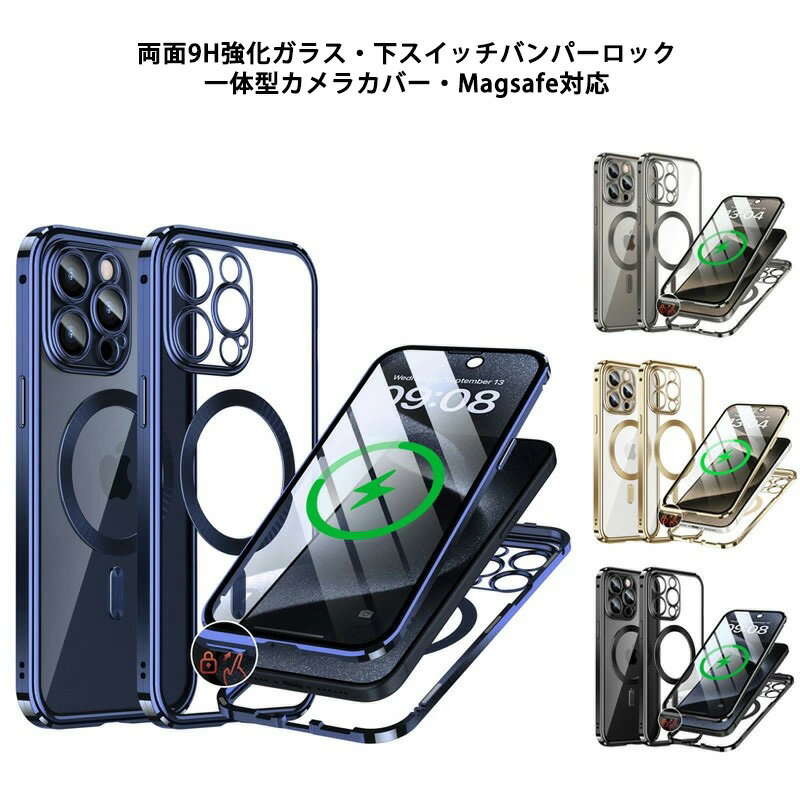 iPhone15 ケース 一体型 Magsafe対応 下スイッチバンパーロック iPhone 15Plus 15Pro 15ProMax ケース 両面 9H強化ガラス 透明 カバー アルミバンパー クリアケース アイフォン15 15プラス 15プロ マックス カバー メタルバンパー カメラ保護 両面ガラス 透明ケース