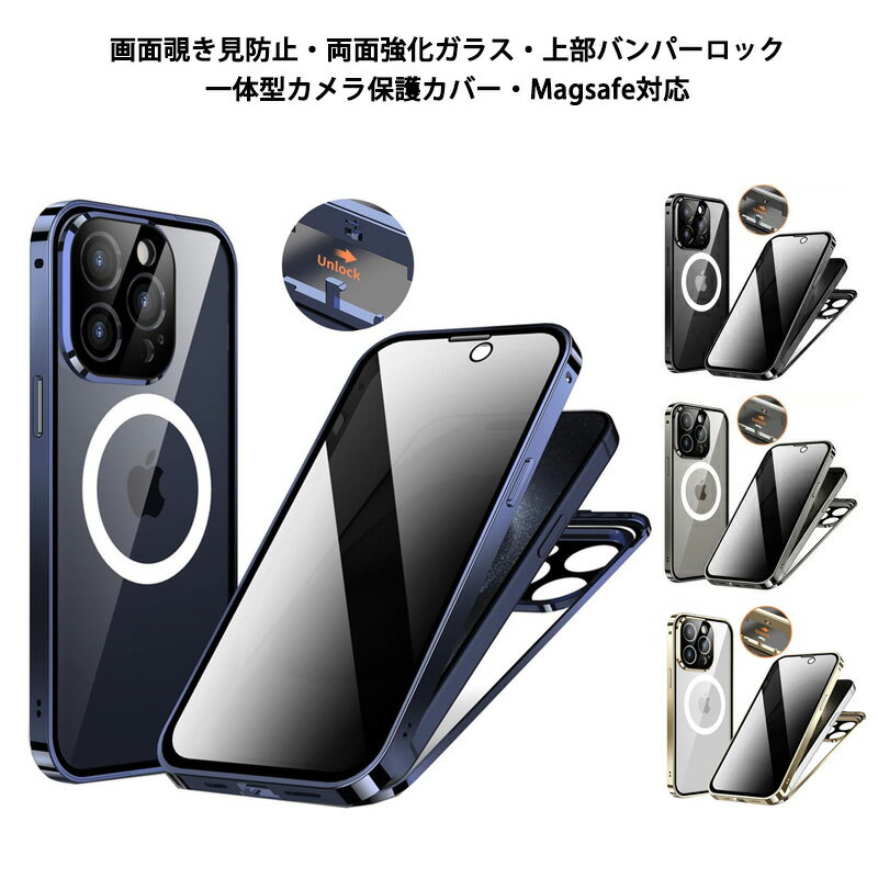 覗き見防止 両面ガラス 上部バンパーロック Magsafe対応 iPhone 15Pro 15Plus 15ProMax ケース 全面保護 9H強化ガラス アルミバンパー アイフォン 15プラス 15プロ 15プロマックス カバー ガラスケース
