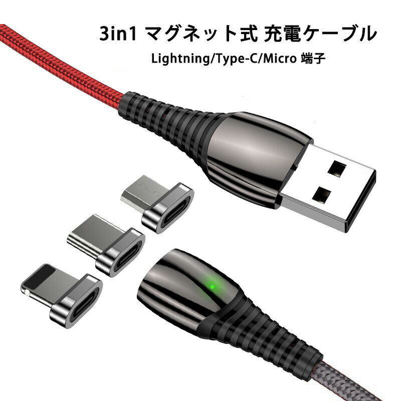 3in1 マグネット 充電ケーブル 端子 セット 急速充電 データ伝送 5V/3A 9V/2A QC4.0 Lightning iPhone Micro USB Type-C 充電 ケーブル ナイロン 編み Xperia Galaxy ASUS HUAWEI Android MicroUSB ライトニングケーブル タイプC マイクロUSB マグネットケーブル 1m 2m