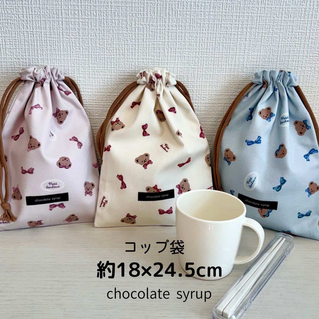 メール便 ★ くま リボン 柄 コップ袋 巾着袋 マチなし ★ 女の子 男の子 小学生 入園グッズ 入学グッズ 日本製 保育園 巾着 かわいい おしゃれ 縦長巾着 子供 幼稚園 入園 小学校 入学準備 クマ チョコレートシロップ
