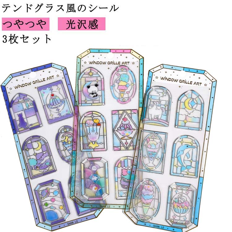【ステンドグラス風うるつやシール】3枚セット シール おしゃれ 透明 かわいい ステンドグラス ガラス 窓 ねこ 猫 パンダ 食べ物 カフェ 喫茶店 レトロ シール交換 スマホケース ご褒美シール 立体感 つやつや 光沢 推し活 グッズ SNSで大人気 デコシール シール帳