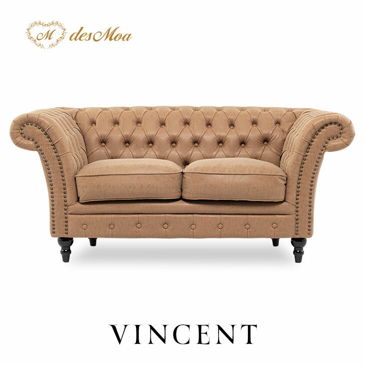 VINCENT ヴィンセントシリーズ 英国調 2人掛けソファ 2シート 2人用 コンパクト アンティーク調 レトロ クラシカル エレガント 上品 高級感 可愛い おしゃれ 店舗什器 応接室 サロン ディスプレイ レストラン ホテル 木製 輸入家具 合成皮革 合皮 キャメル VJ2P39K
