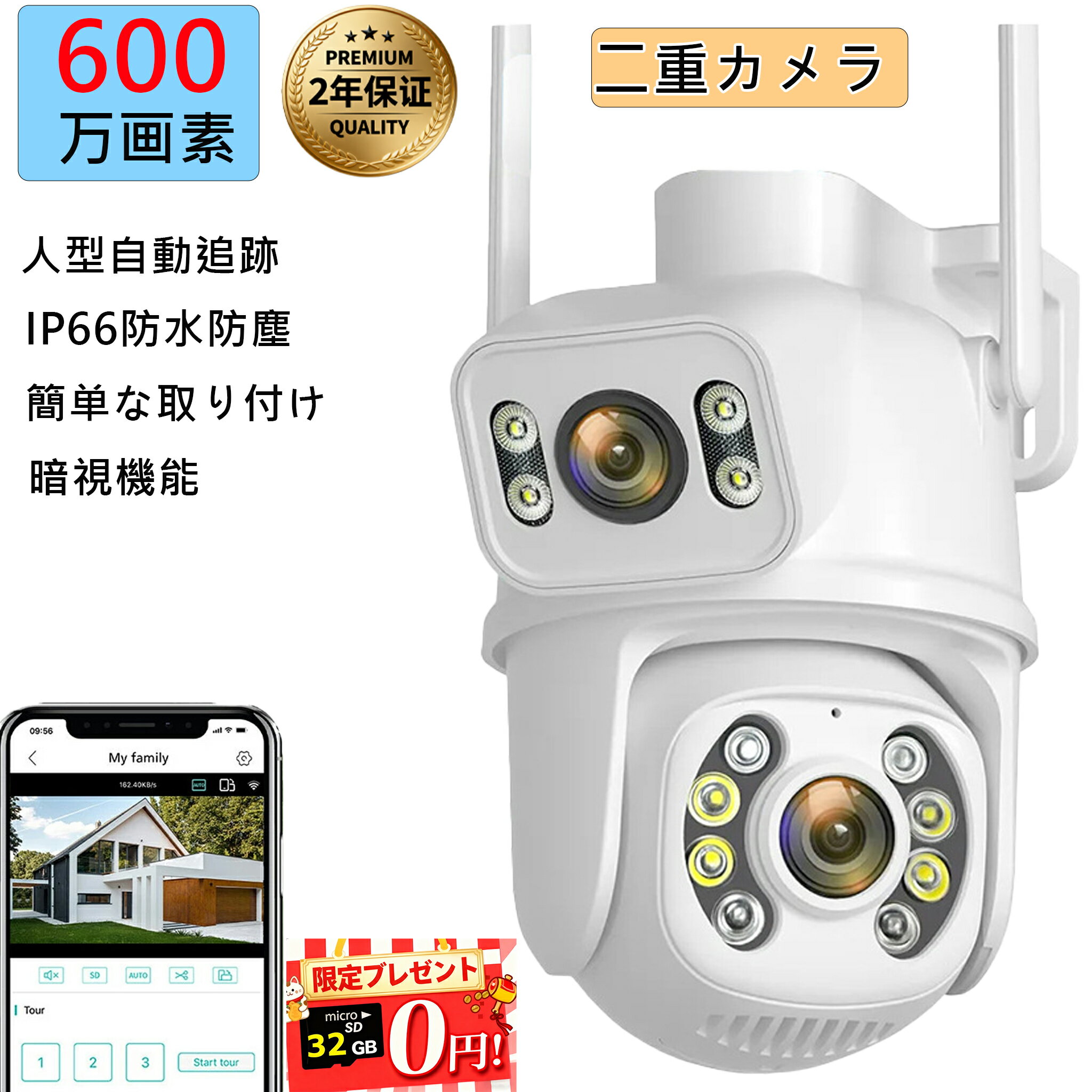 【2年保証】防犯カメラ 屋外屋内 監視カメラ 600万画素 高画質 二重カメラ IP66防水防塵 ワイヤレス wifi 家庭用 夜間カラー撮影 自動追跡 双方向通話 録画 AI人感検知 単純な設定 工事不要 屋外セキュリティカメラ 録音 sdカード録画 動体検知 自動追跡 スマホ