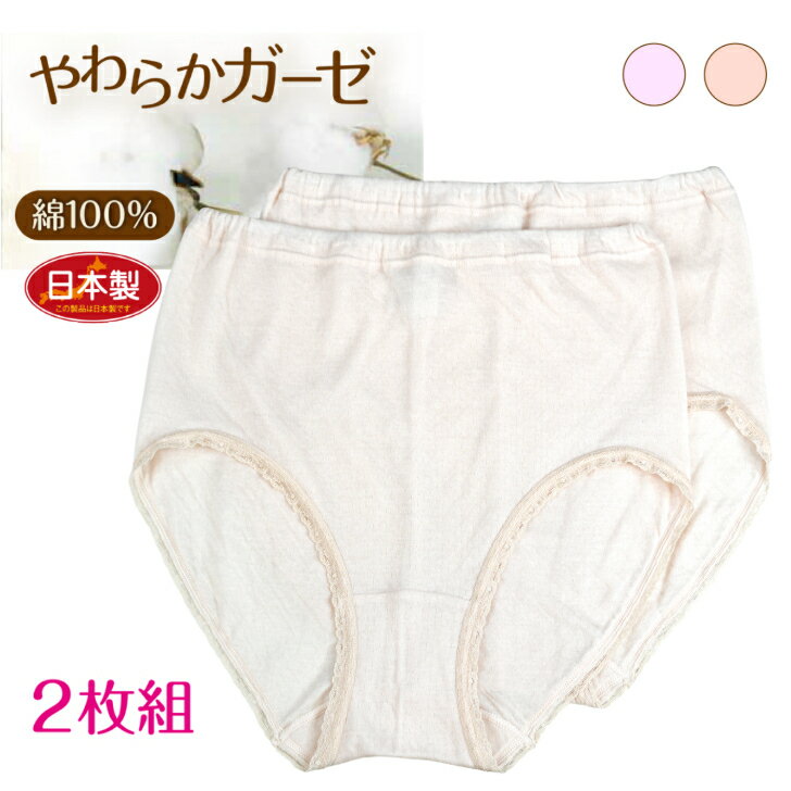ガーゼ調ショーツ 2枚組 綿100% 日本製 レディース 婦人 肌着 下着 ショーツ インゴム ゴム入れ替え可能 綿 ガーゼ調 柔らか 袋編み レース ピンク/ベージュ M-LL 13040