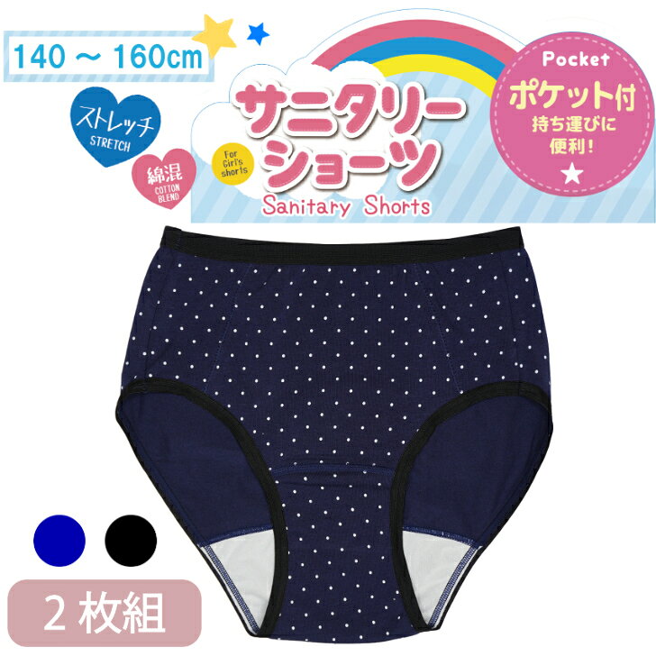 【2枚組】 ジュニア用サニタリーショーツ 女の子 ジュニア サニタリー 生理用 抗菌防臭 ポケット付き 綿混 下着 小学生 中学生 クロ/杢チャコール 140-160 11150