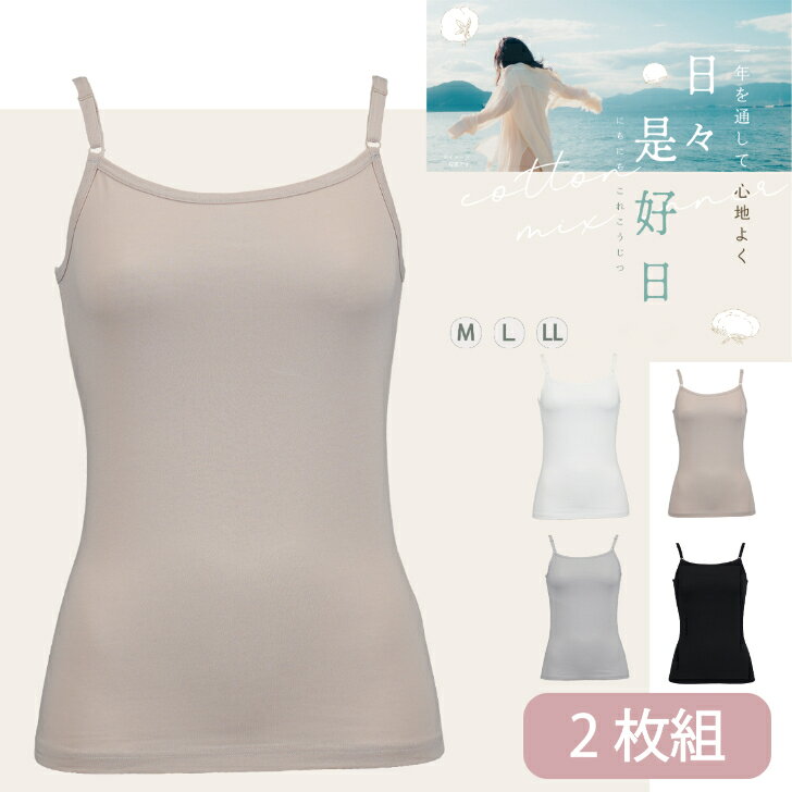 【2枚組】 キャミソール レディース 綿混 柔らか 超長綿 無地 カジュアル 通年対応 ストレッチ 婦人 肌着 下着 ベージュ/オフホワイト/グレー/クロ M-LL 16174