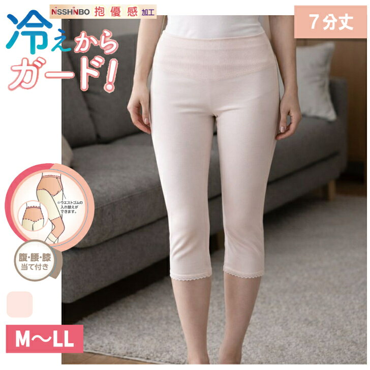 日本製 綿100% 7分丈 レディース 婦人 肌着 インナー ボトム 腰当て付 膝当て付 当て付 インゴム ゴム入れ替え可能 冷え対策 冷房対策 シニア 高齢 ピーチ M-LL 14365