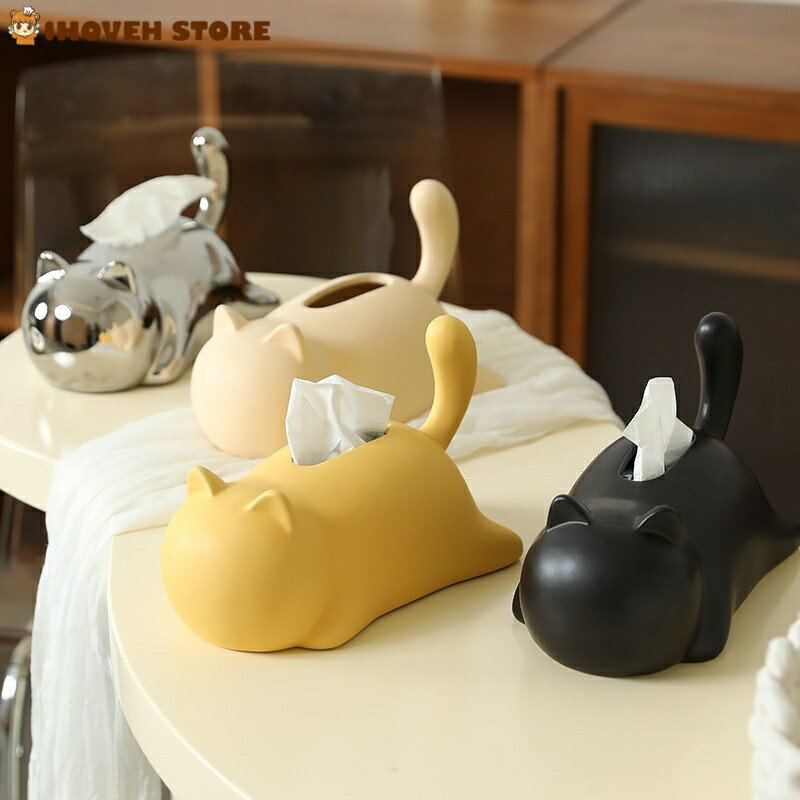 【手作り風 猫モチーフ】陶磁器 ティッシュボックス 紙箱 インテリア 置物 シルバー/薄黄色/ブラック/濃黄色 約15×24.8cm【海外通販】