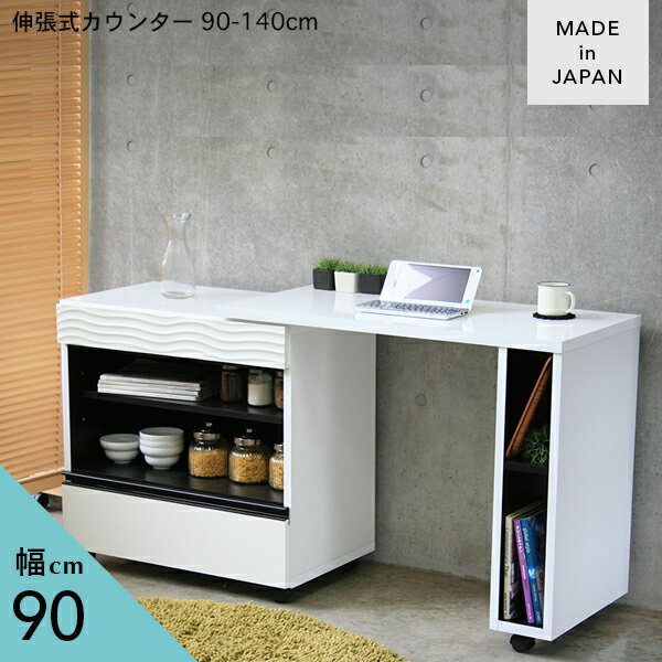 [送料無料] キッチンカウンター 伸張式 幅90cm 幅140cm 作業台 キッチン レンジ台 ホワイト鏡面 おしゃれ 完成品 省スペース 完成品 カウンター 収納 一人暮らし 90 140 国産 日本製