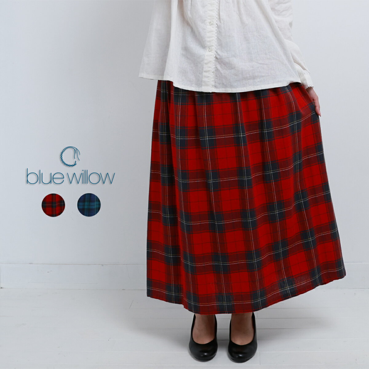 blue willow コットンリネン チェックギャザーフレアスカート レディース ブルーウィロー 01EWP13517 ウエストゴム ミモレ丈 フレア 服 おしゃれ 40代 50代 60代 ブランド かわいい 春 秋 冬 大きめ 綿 コットン タータンチェック ブラックウォッチ