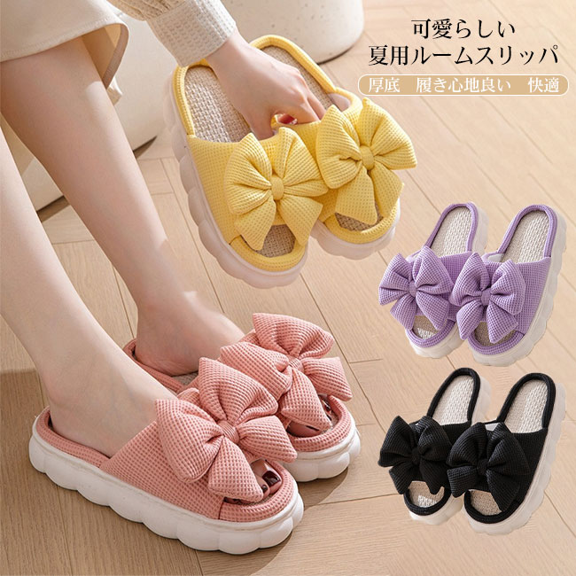 【送料無料】スリッパ ルームシューズ レディース 厚底 前開き 綿麻 リボン かわいい おしゃれ 快適 来客用 室内 部屋履き 軽量 滑り止め 通気性 シンプル オールシーズン オフィス 引っ越し 職場 事務所 履き心地良い カラバリ豊富