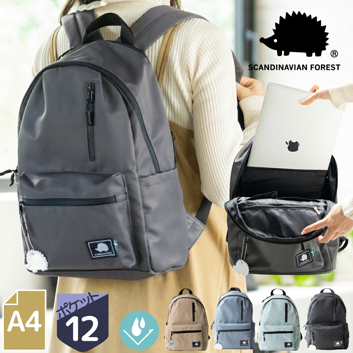 スカンジナビアンフォレスト リュック 背面ポケット 12ポケット A4 13インチPC 止水ファスナー 撥水 マザーズバッグ リュックサック SCANDINAVIAN FOREST 251-KESF204