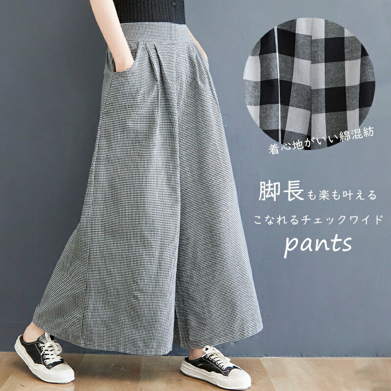 チエック柄 ガウチョパンツ ワイドパンツ ロング スカーチョ キュロット パンツ ガウチョ ワイド ボトムス レディース 無地 ロングパンツ ゆったり ハイウエスト ウエストゴム 体型カバー カジュアル風 フレアパンツ 20代30代40代50代60代 薄手 涼しい