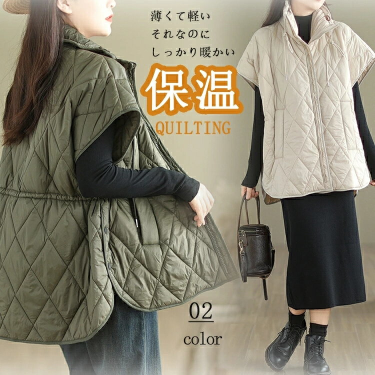キルト ベスト レディース おしゃれ キルティングベスト 軽い 暖かい 中綿ベスト ハイネック ジップアップ キルティングジャケット ブルゾン 冬 秋 レイヤード 重ね着 アウター 秋冬 ジレ ミディアム丈 ダイヤ柄 部屋着 ゆったり 中綿入り フレンチスリーブ