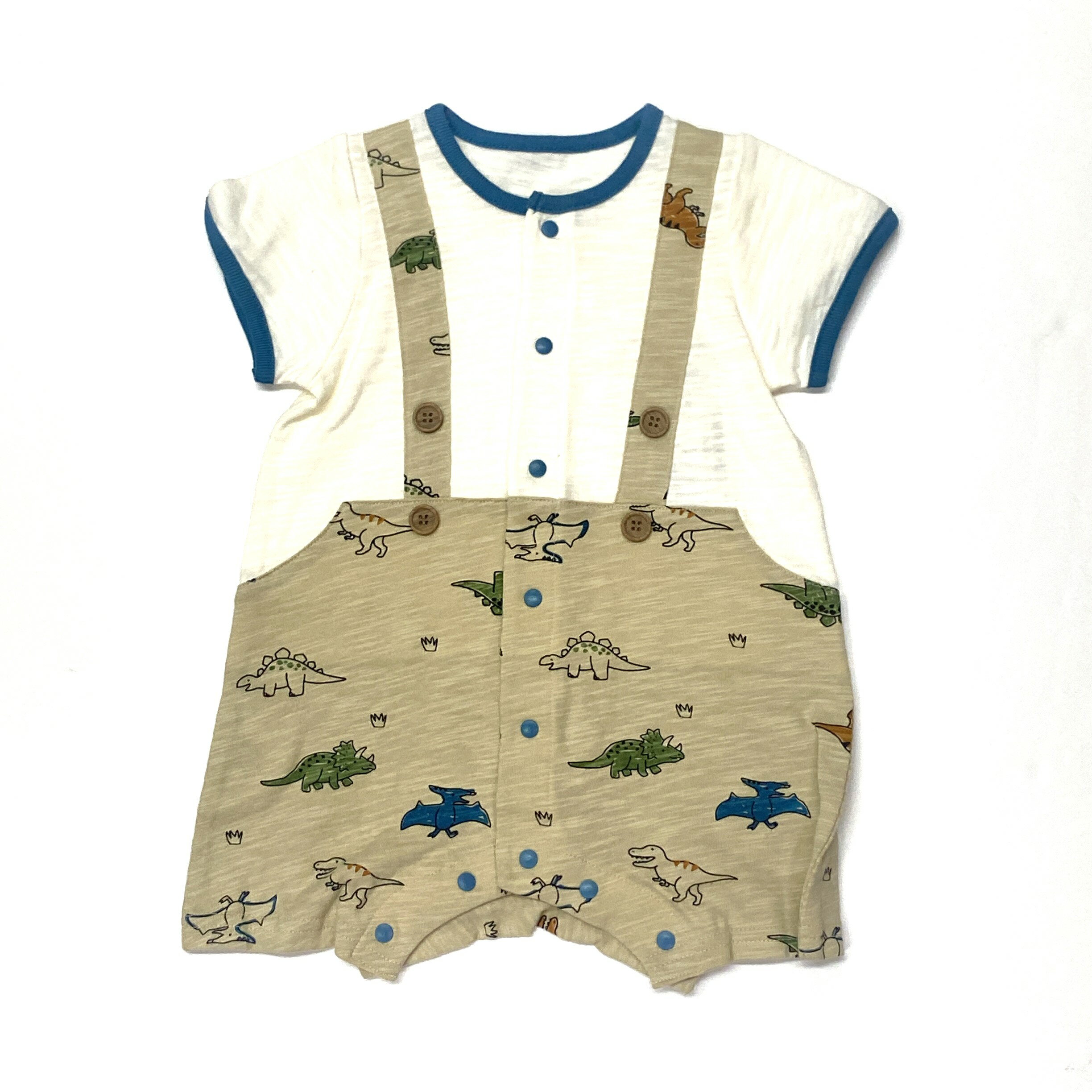 【重ね着風で1枚でコーディネート完成!】 ベビー ミニオール 恐竜 サロペット キョウリュウ カバーオール 出産準備 男の子 ベージュ 60-70 60 70 かわいい 便利 おしゃれ 新生児 可愛い 赤ちゃん 春 夏 夏生まれ