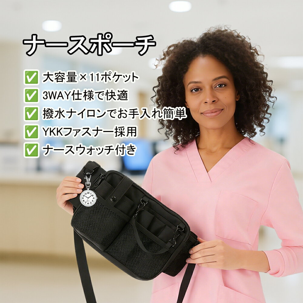 【ナースウォッチ付き】ナースポーチ 3WAY仕様 11ポケット 大容量 A5・iPad mini収納可能 超軽量180g 撥水ナイロン YKKファスナー 看護・介護・美容・作業用 男女兼用 送料無料
