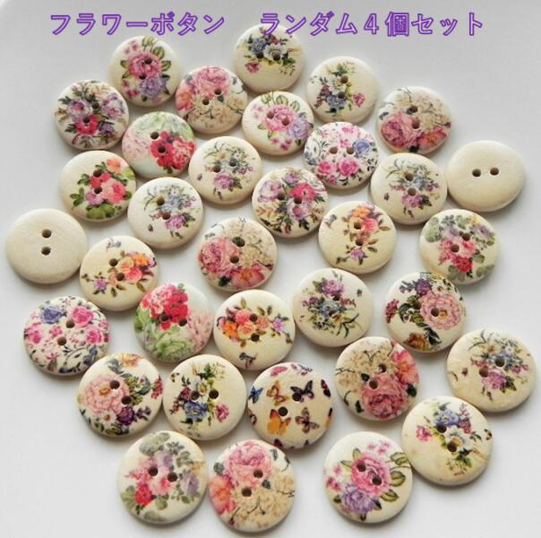 ◇ 可愛いフラワー柄のボタン ミックスセット ◇ 4個入り 🌹 フラワー柄 丸型 ウッド ボタン プリントボタン 花 薔薇柄 ウッド 木製 裏側木目 ハンドメイド 手作りしましょう♪ 約20mm